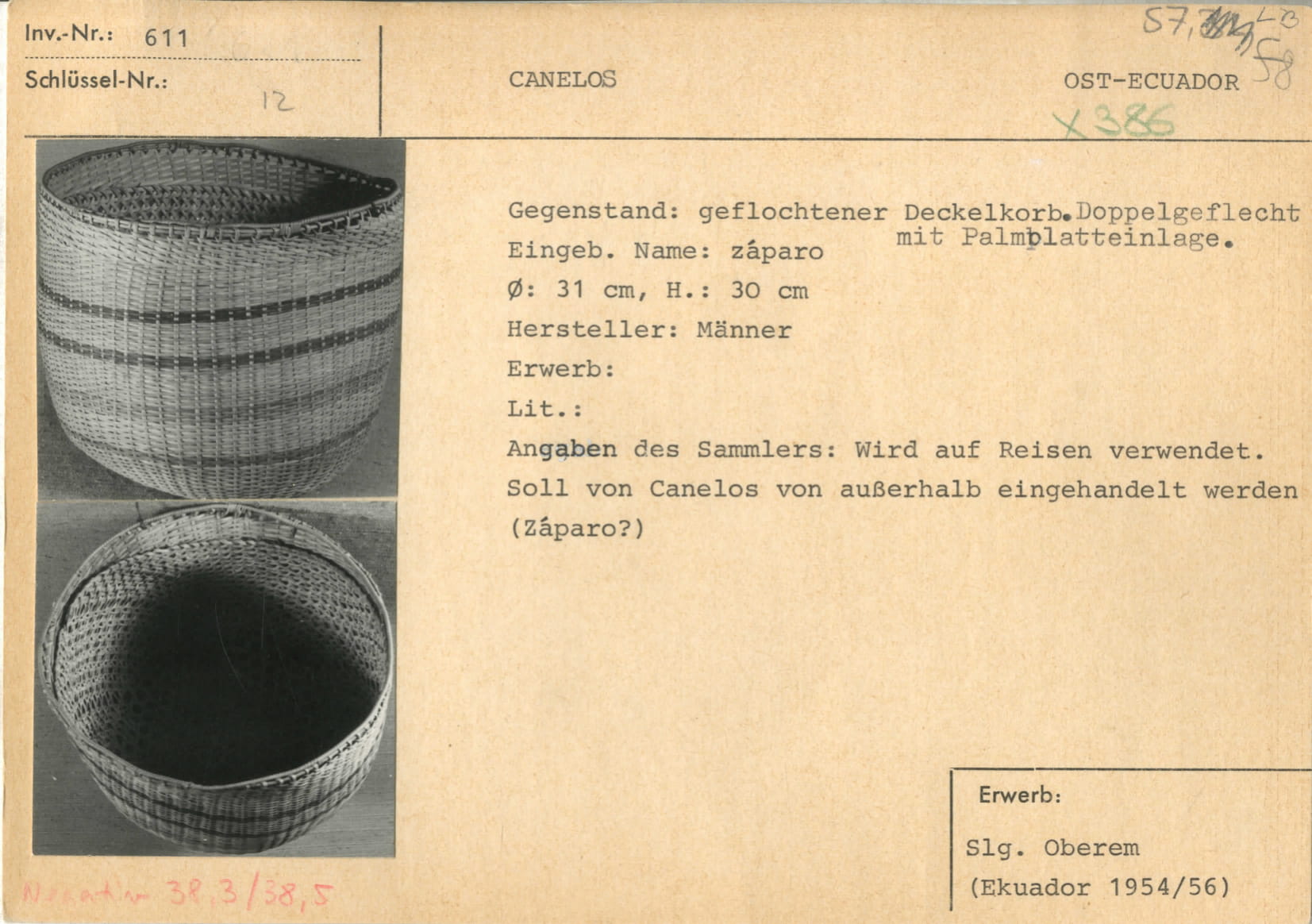 Zeitraum: 1954 bis 1956Von: Ekuador/EcuadorNach: Bonn / Lehr- und Studiensammlung des Seminars für Völkerkunde der Universität Bonn/ BASA-Museum (Bonner Amerikas-Sammlung) / Oberem, Udo